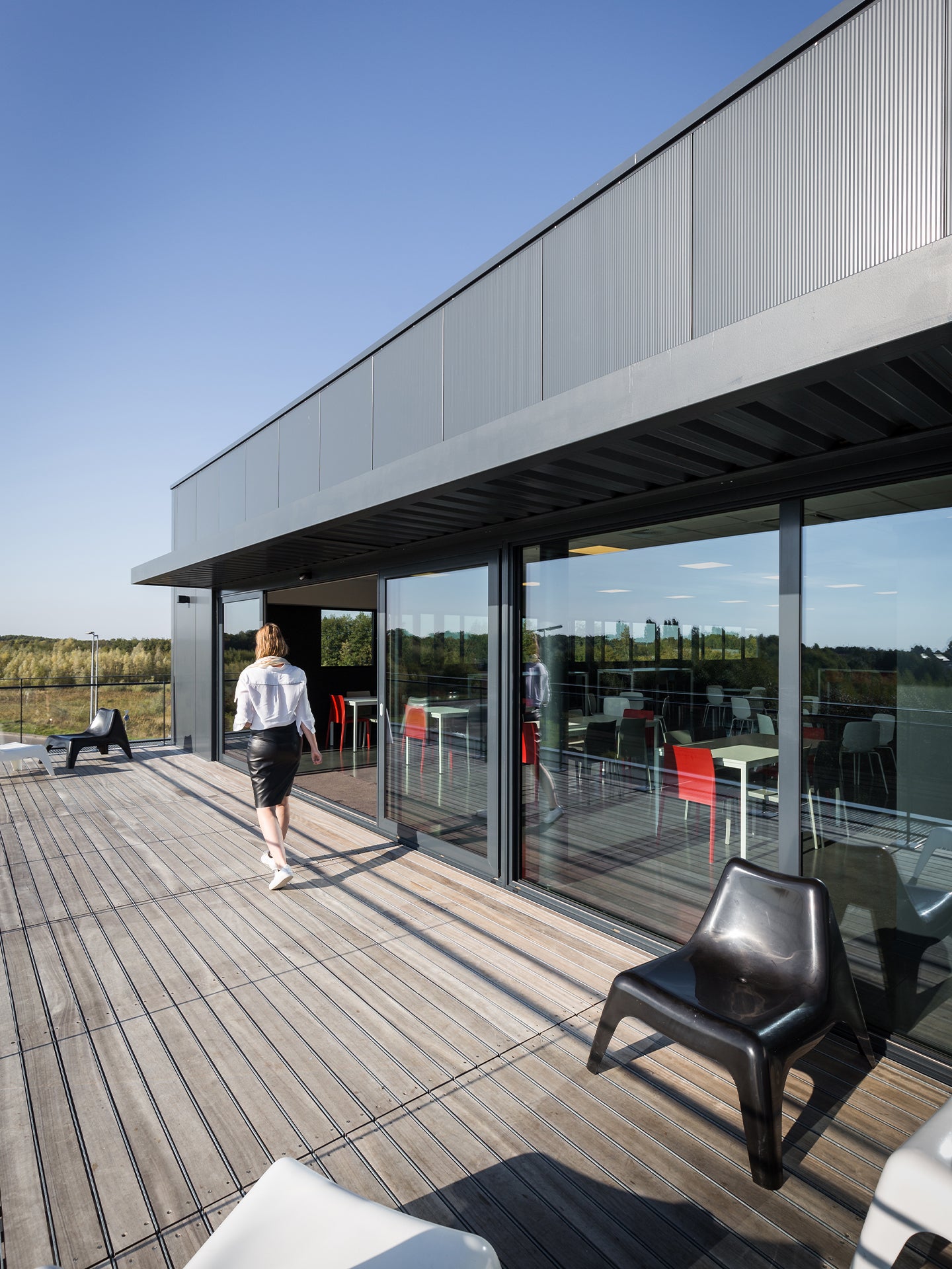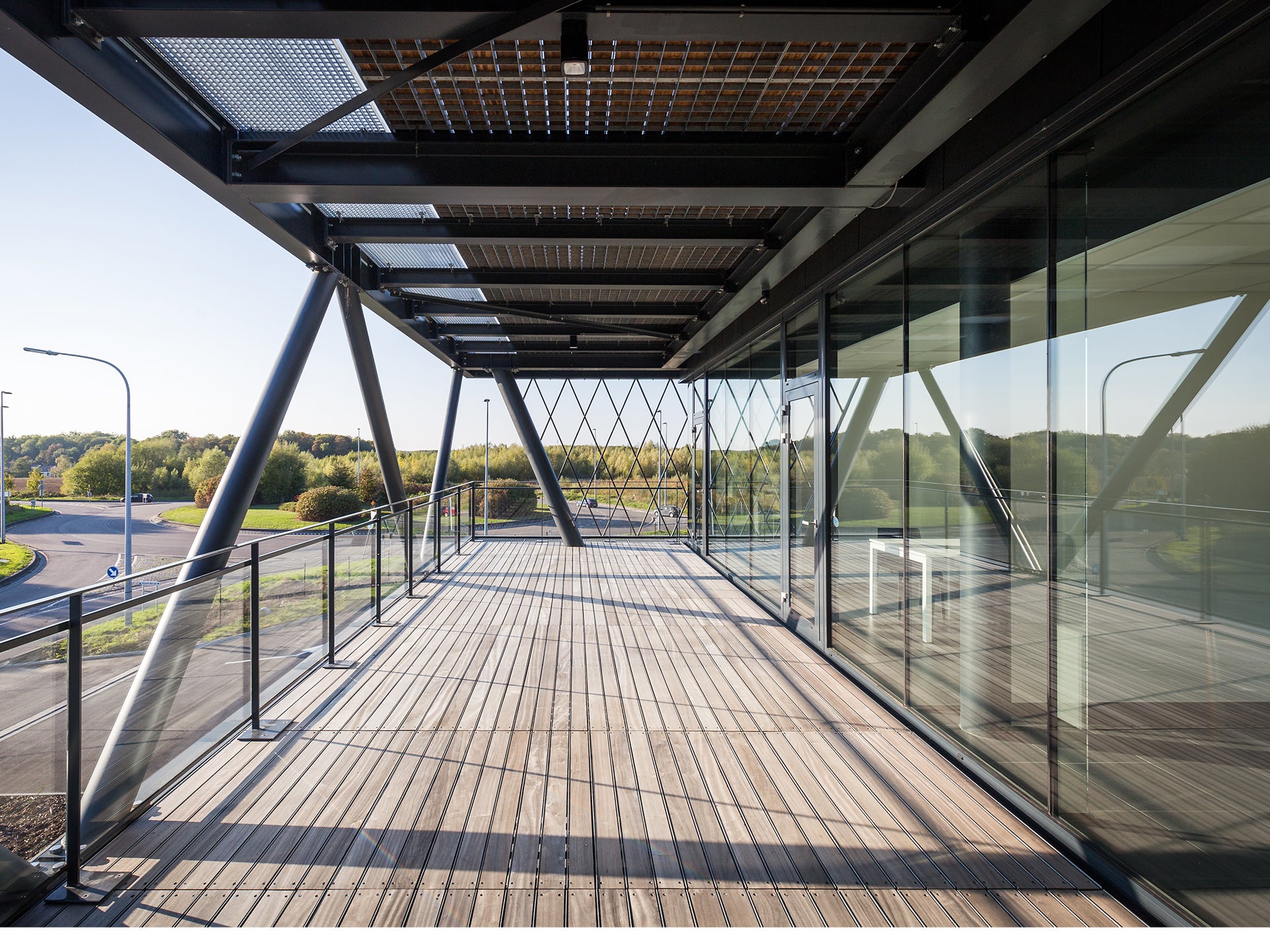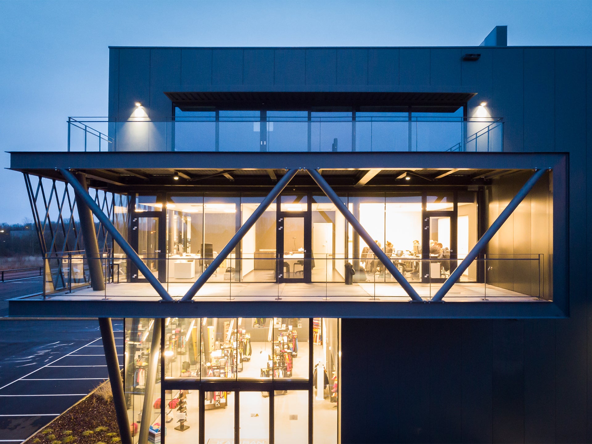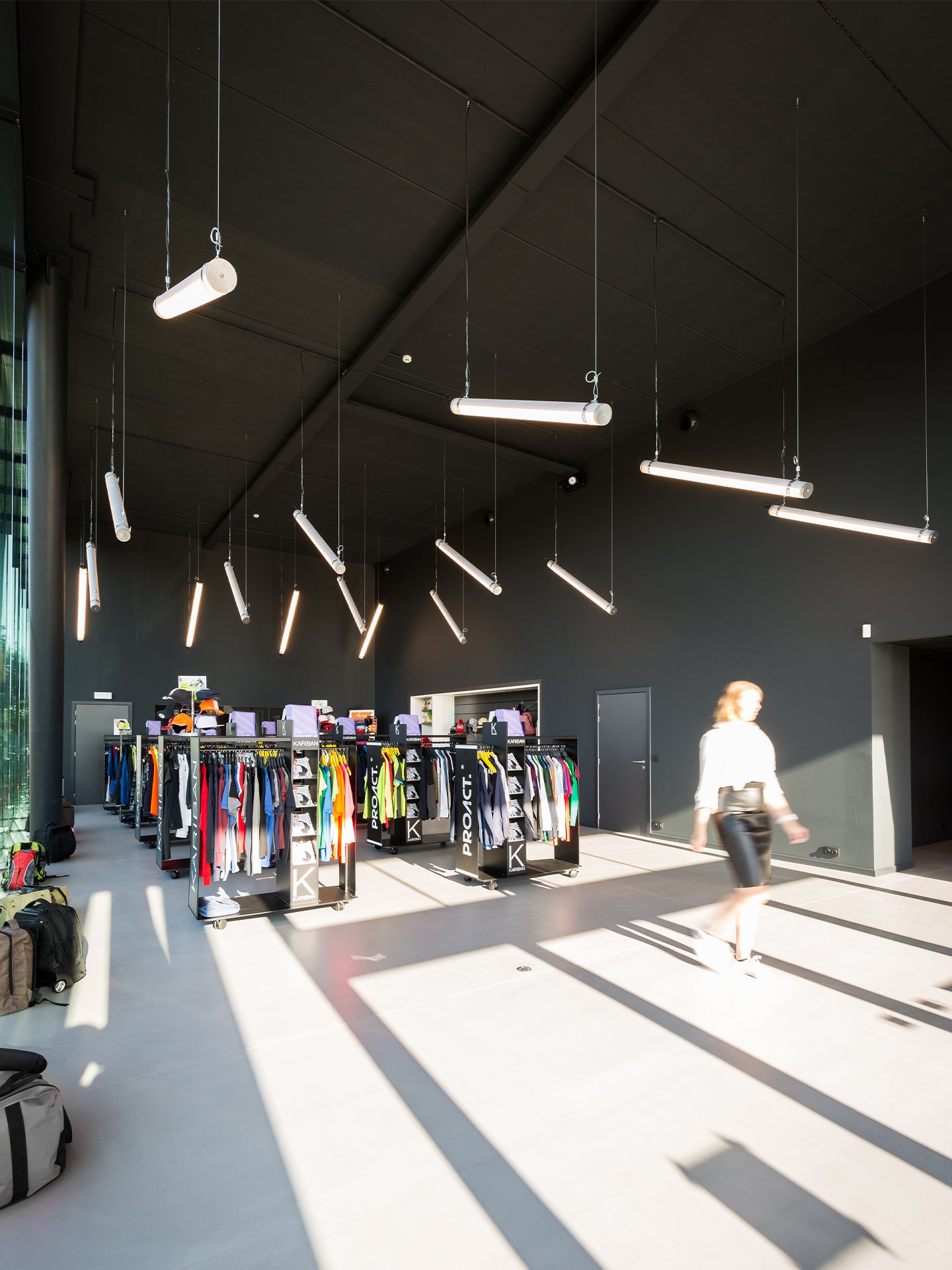 Während der logistische Teil rein pragmatisch angegangen wurde, berücksichtigte das Designteam bei der Gestaltung der Empfangsräume (Büros, Rezeption, Showroom) das Erscheinungsbild des Unternehmens, insbesondere durch die Verwendung eines Metallgewebes, das an die charakteristischen Maschen von Textilien erinnert. Der Beitrag von Joris Ide zu diesem Projekt sind die Paneele, die dem imposanten Gebäude sein stählernes Aussehen verleihen.