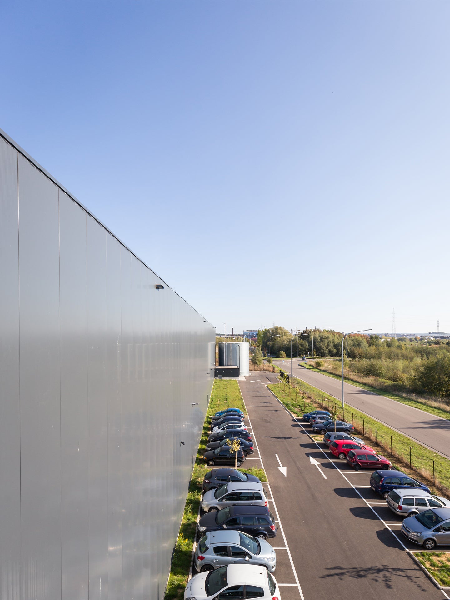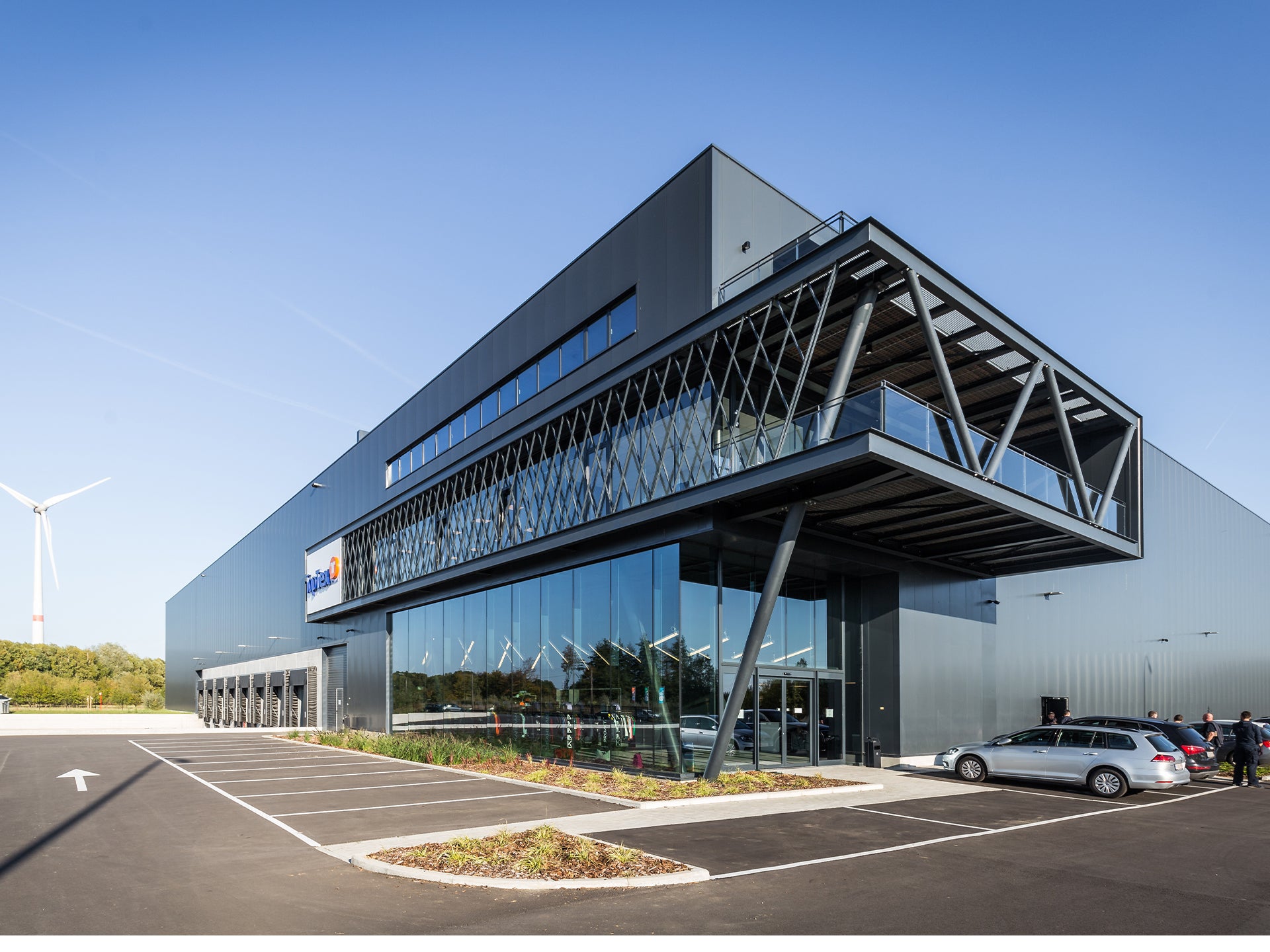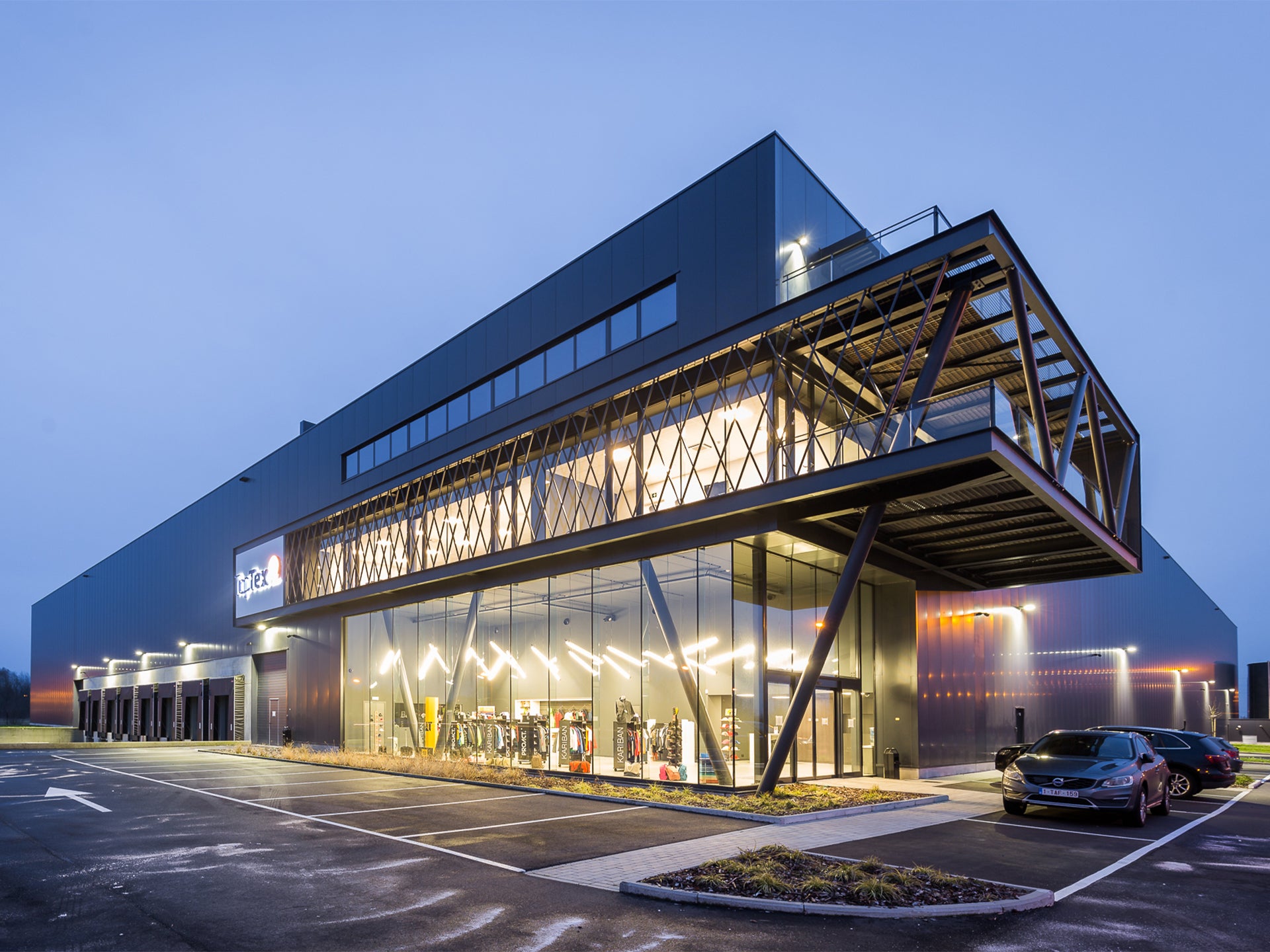 Im Industriegebiet von Houdeng-Goegnies, im Herzen des Hainaut, ließ der französische Textilhändler TopTex ein neues Vertriebszentrum errichten. Mit den Maßen 92 x 109 m, einer Höhe von über 13 m und einer Grundfläche von über 10 000 m² ist es zu einem wahren Stahlgiganten geworden. Das imposante Gebäude basiert auf einem halbautomatischen Prozess, der zur Logistikoptimierung des Unternehmens entwickelt wurde, und umfasst auch einen Ausstellungsraum und Büroflächen.