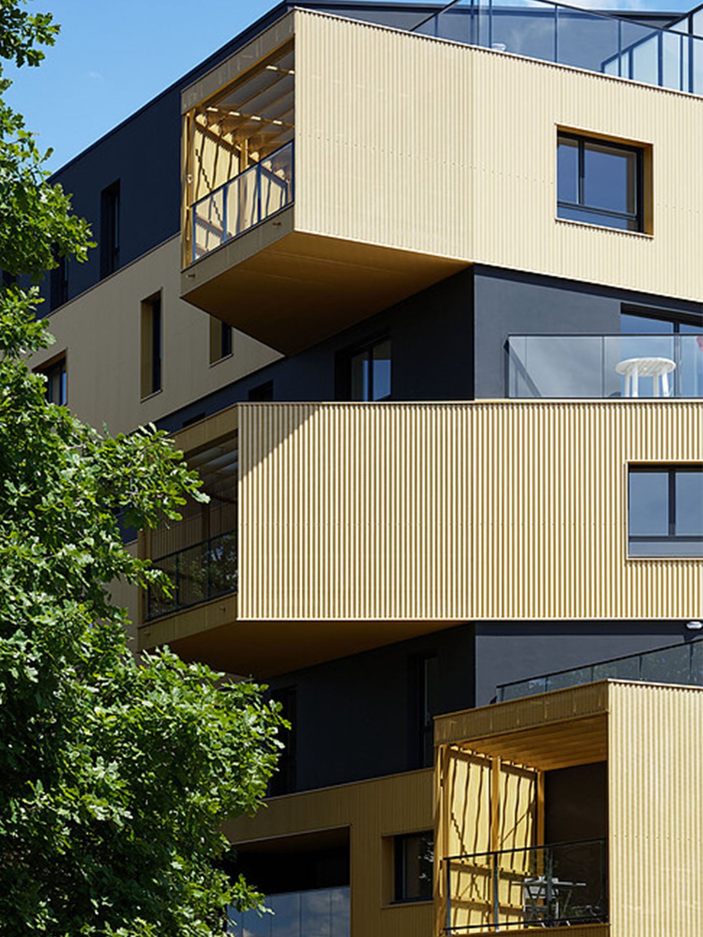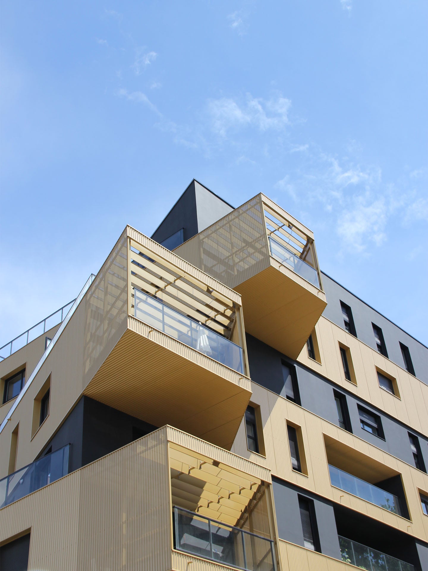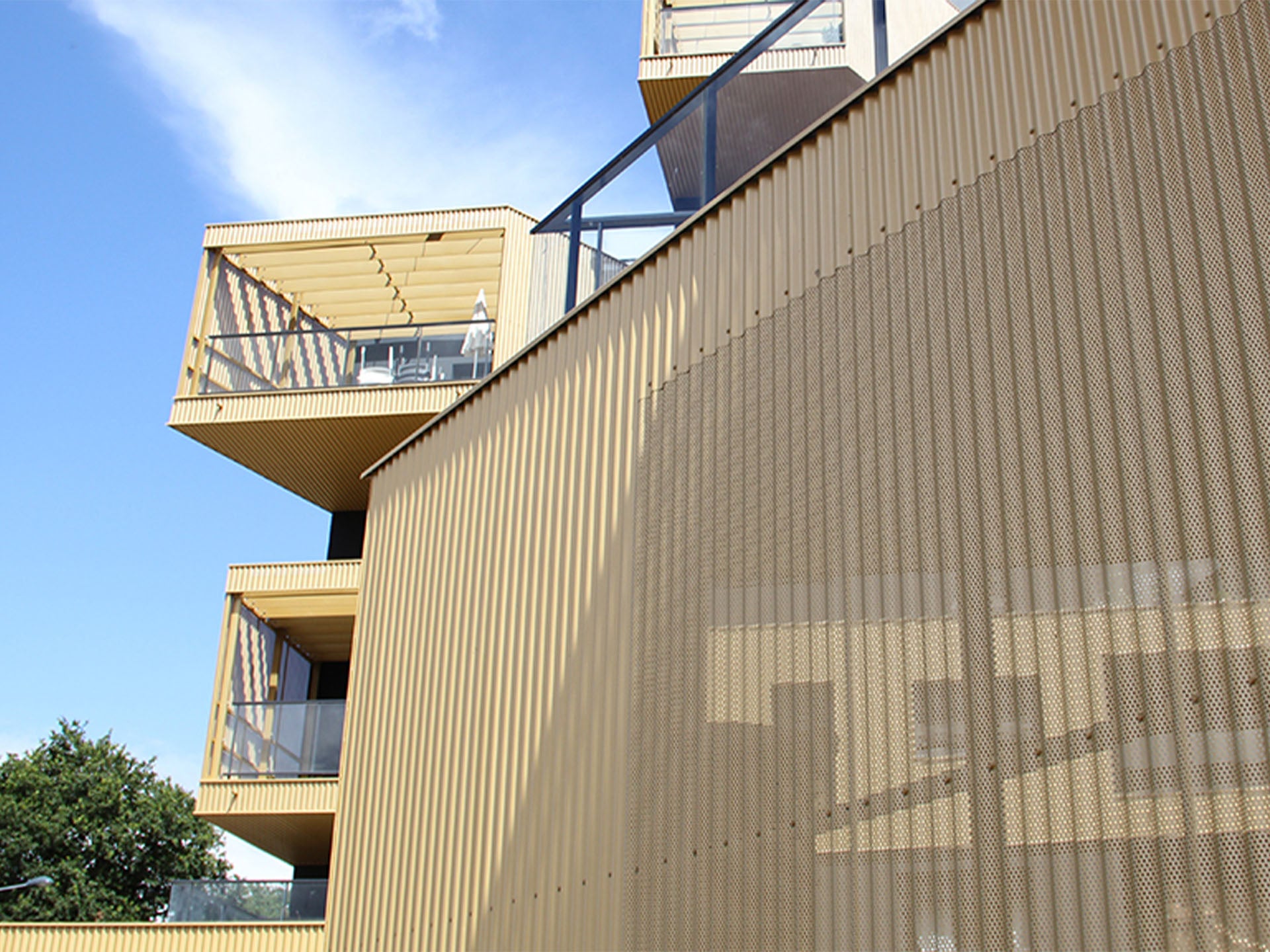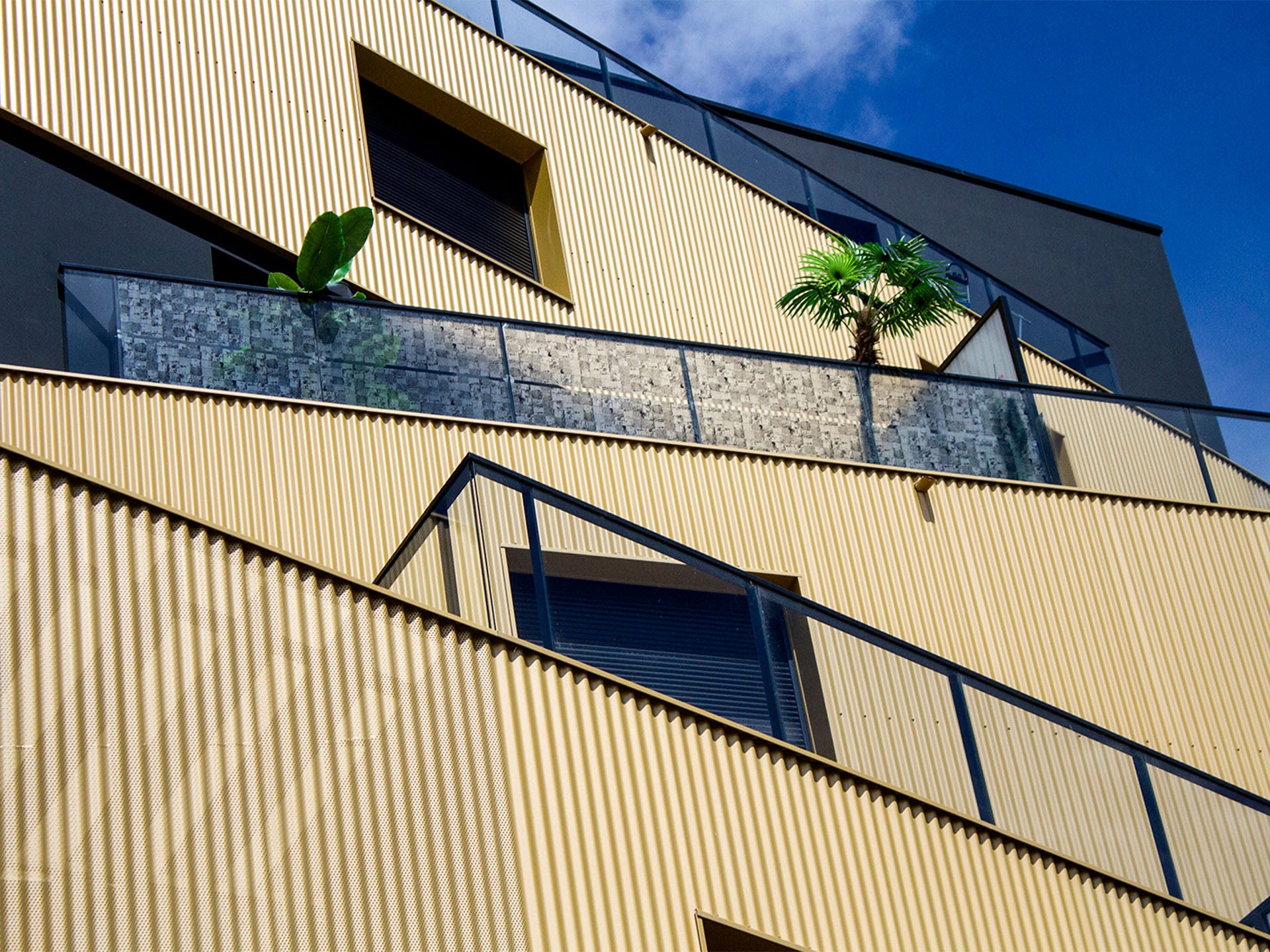 A superb interplay of solid and perforated corrugated profiles, in a flamboyant gold finish. Intriguingly shaped cubic balconies stand out from the landscape.