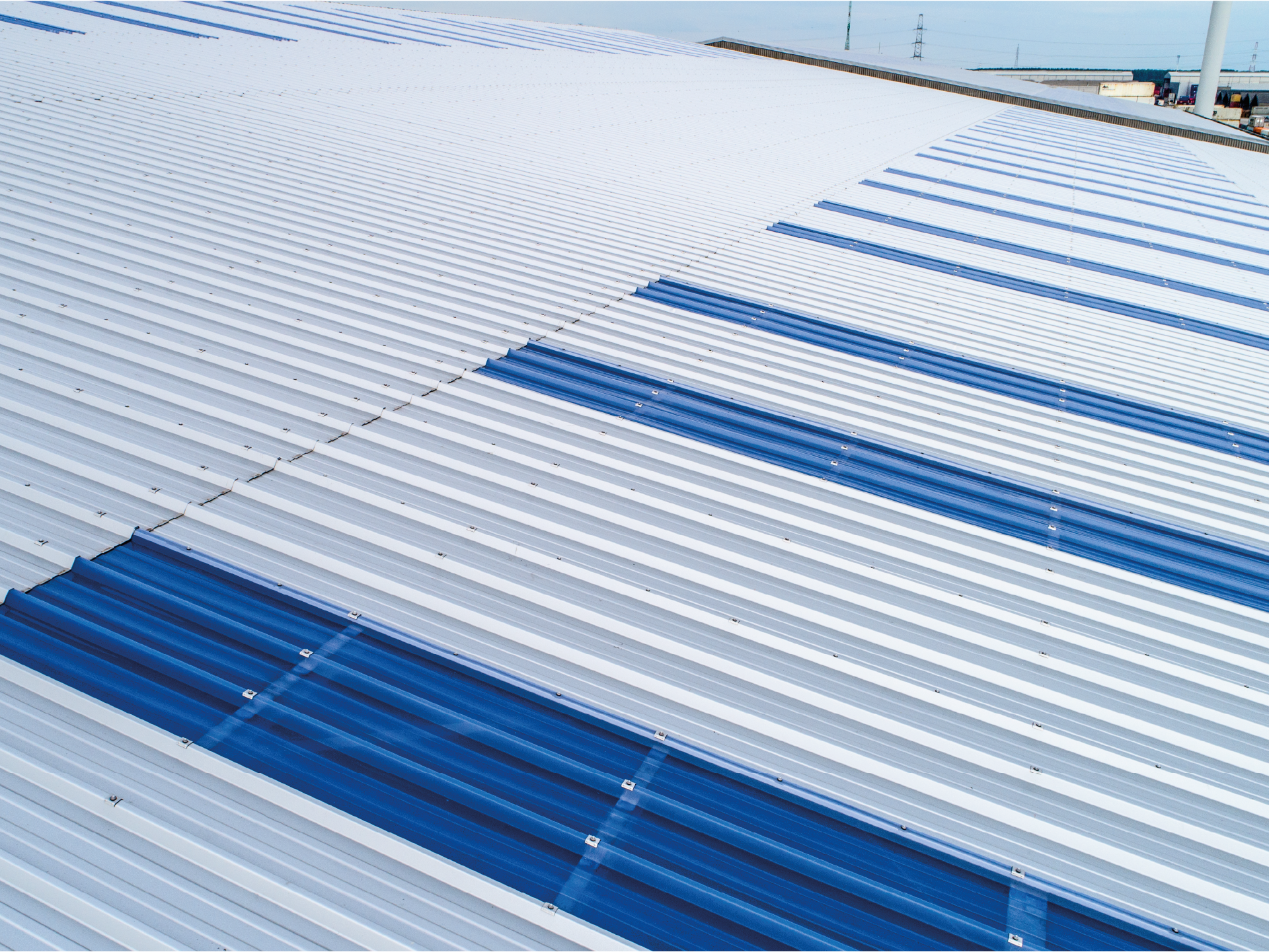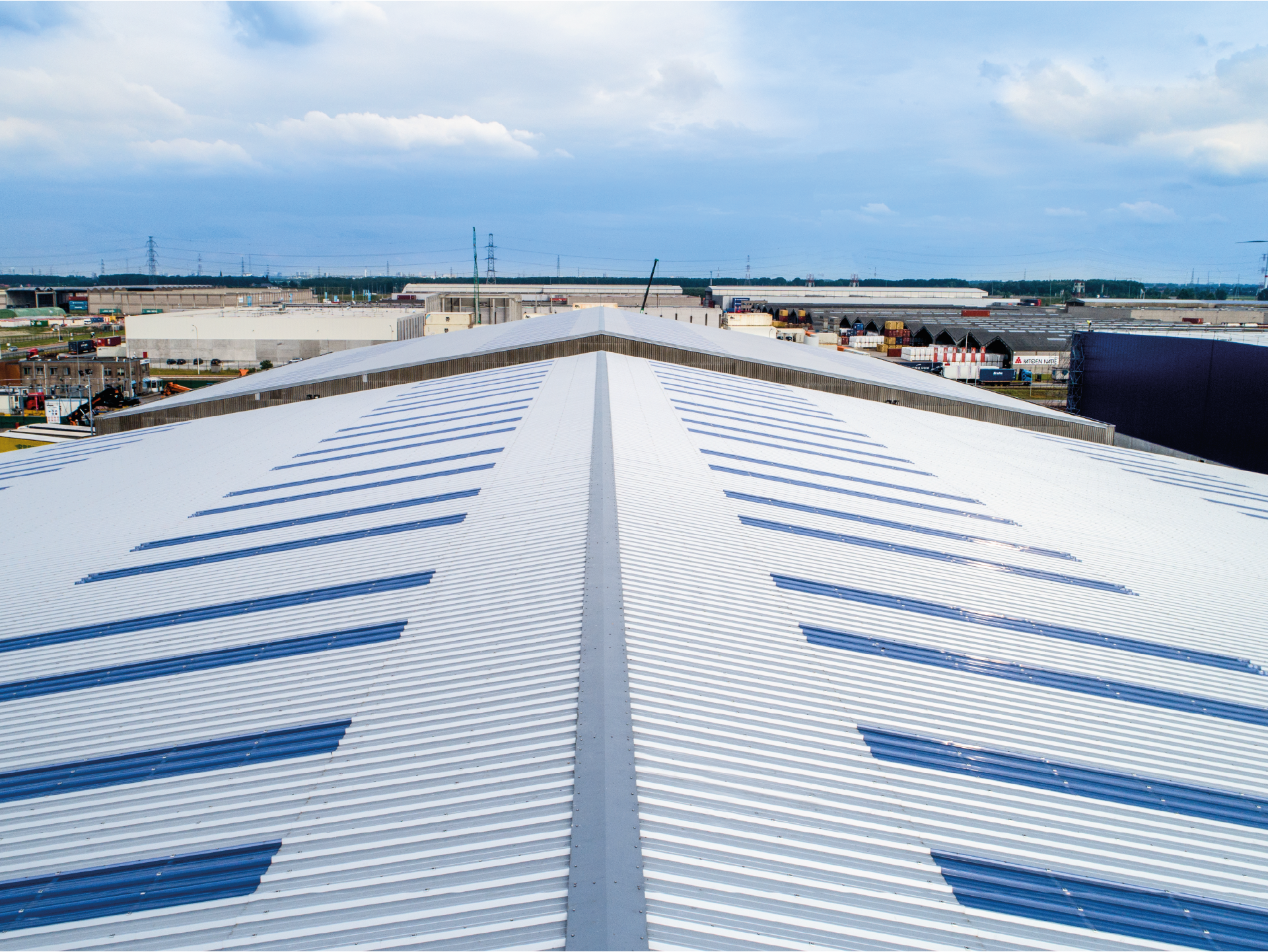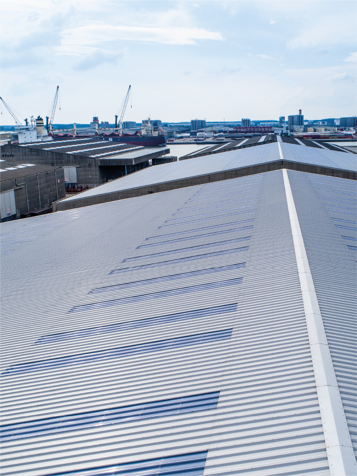 Pour cette rénovation de plus de 8 000 m² de bâtiments de stockage sur l'infrastructure d'Euroports, nous avons utilisé notre produit phare, le JI 45-333-1000 Toiture avec Aquafix.