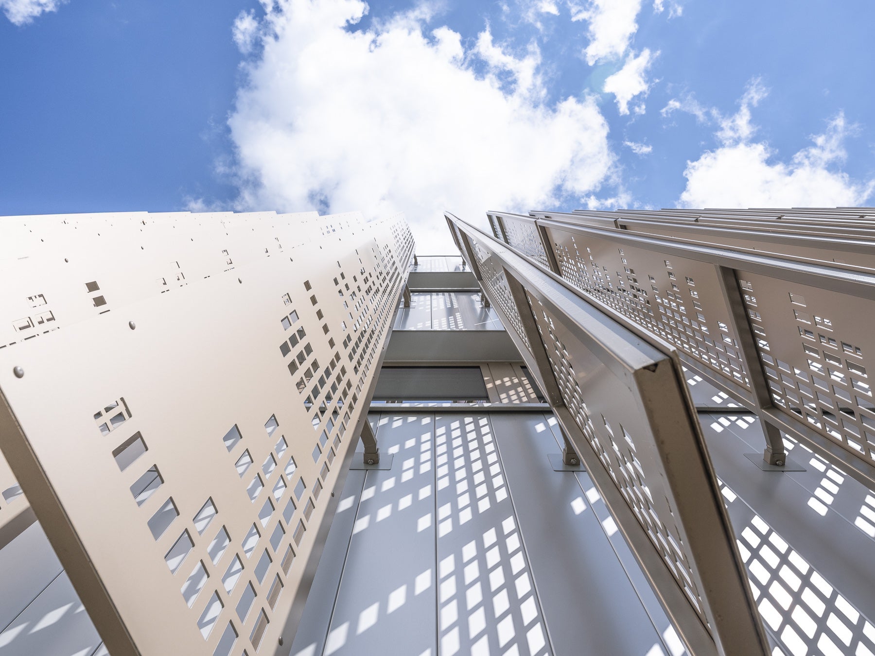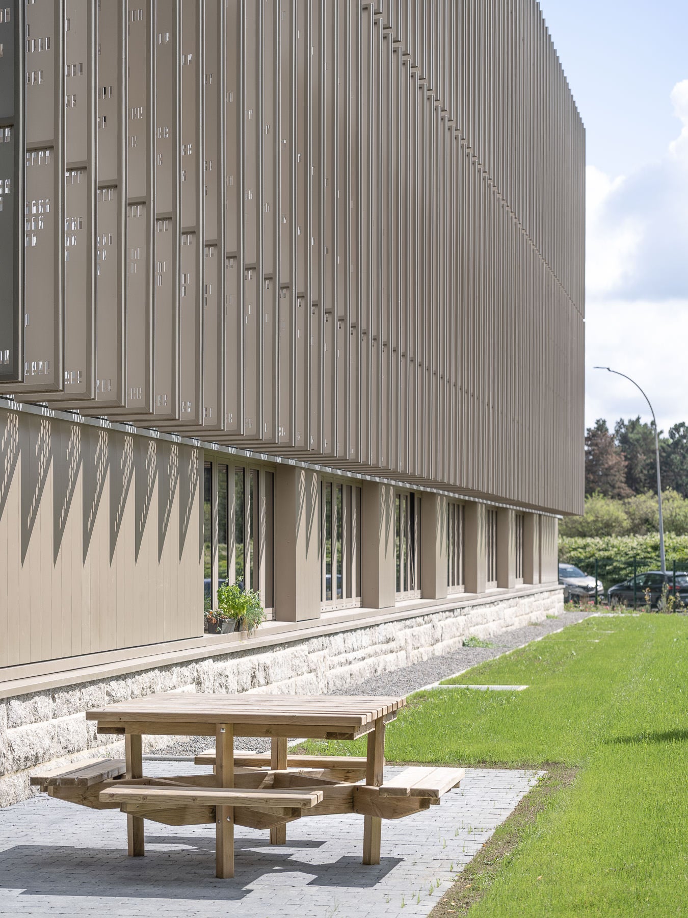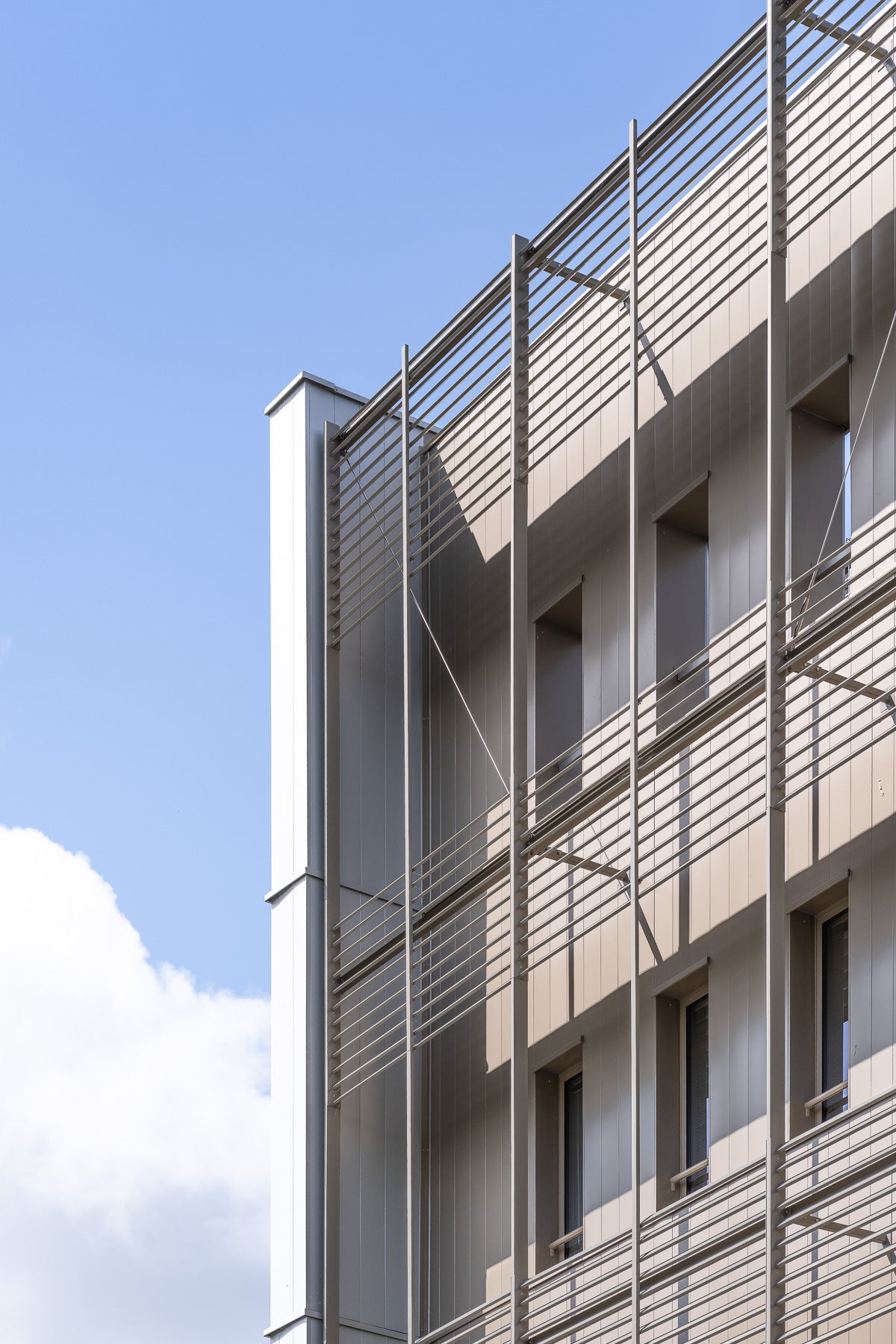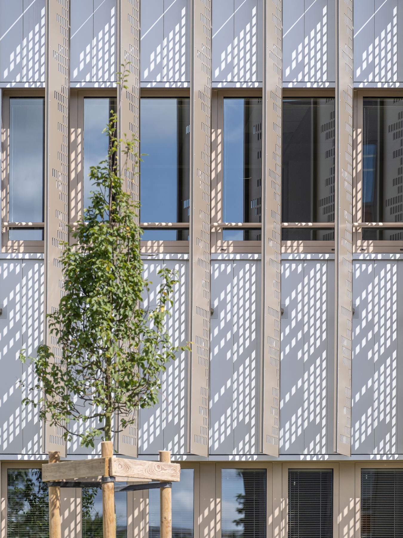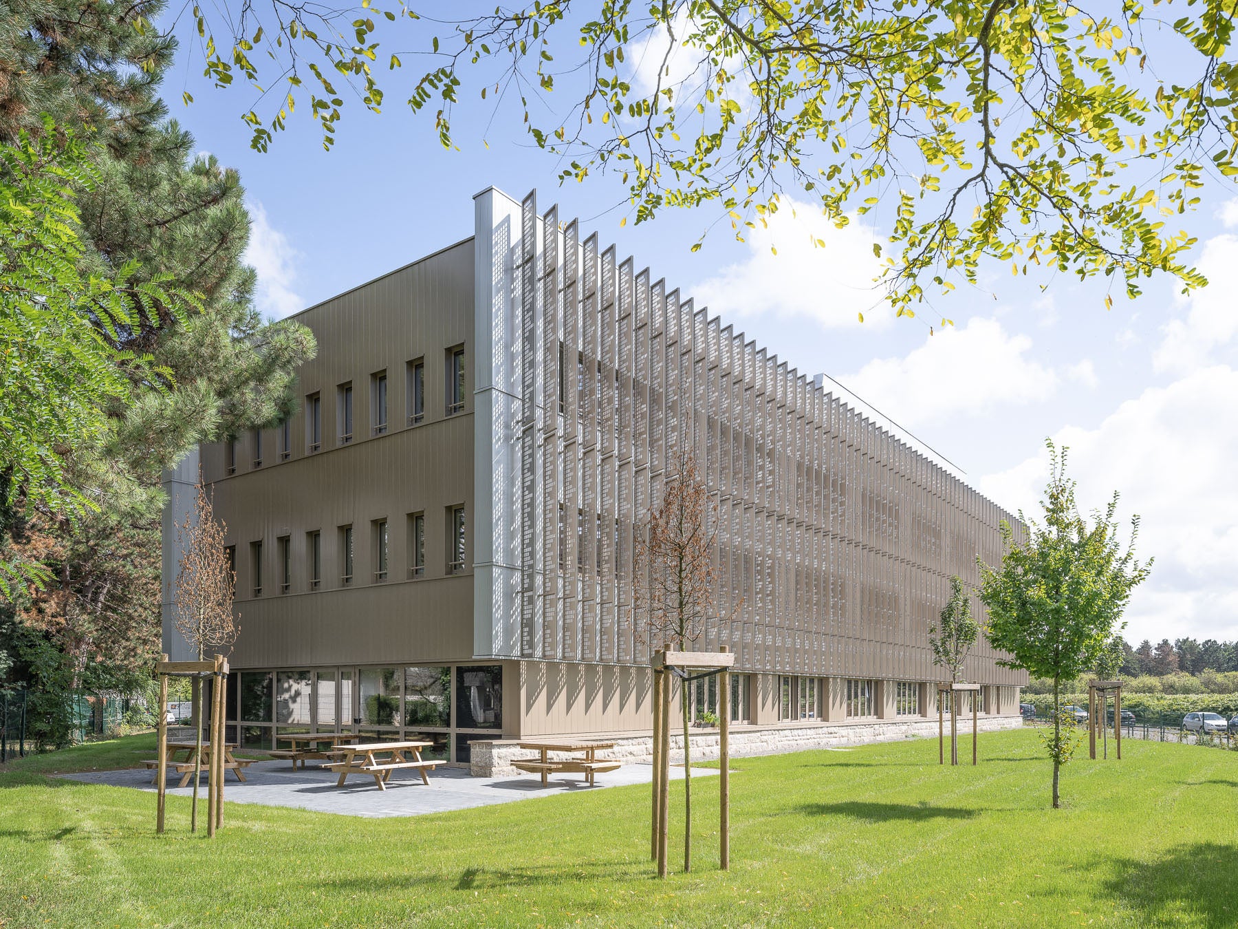 - Le premier, en façade, plus bas, est marqué par des brise-soleils verticaux perforés qui offrent du relief et des jeux de vues.