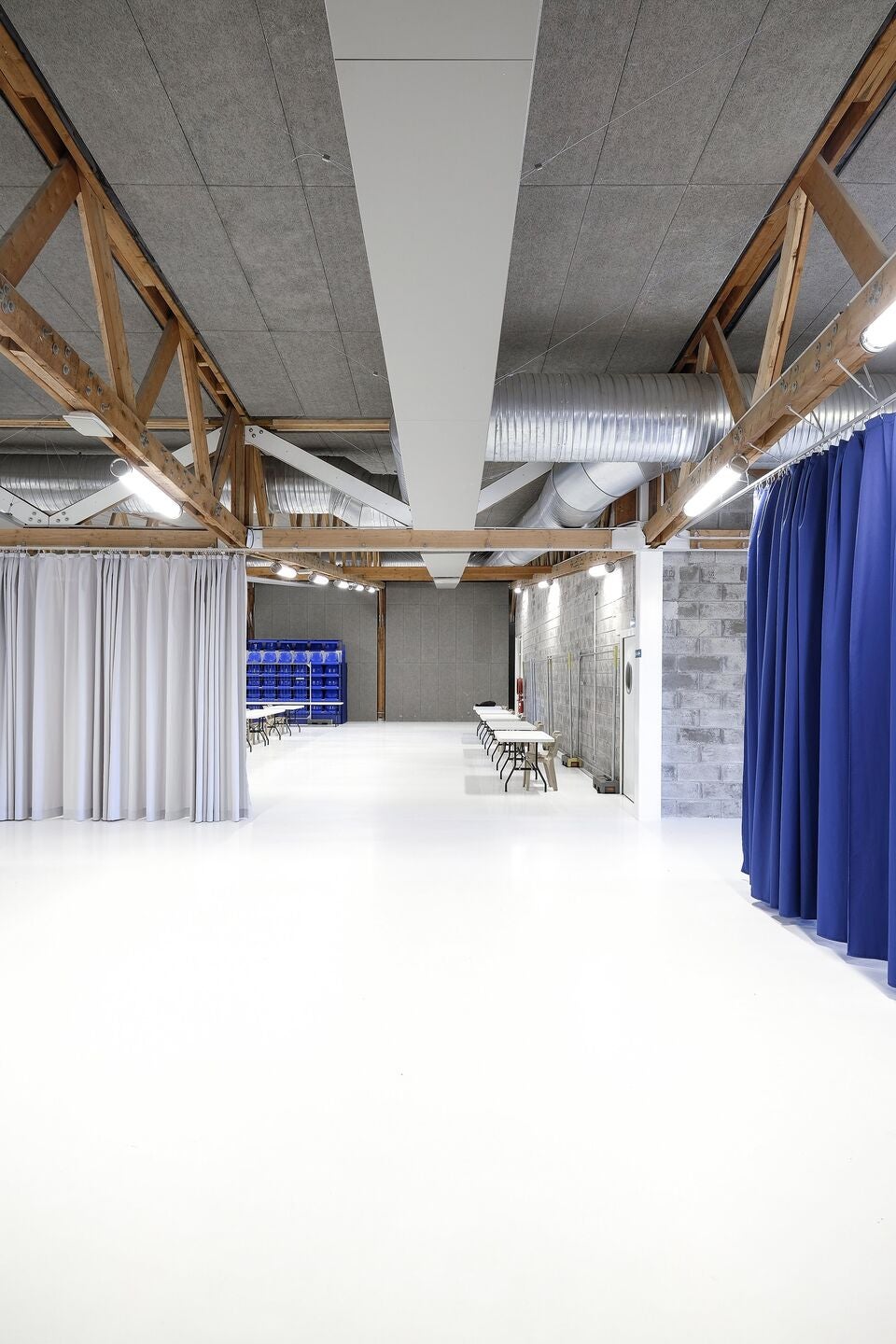 À l'intérieur, les qualités architecturales de la structure existante ont été soulignées et complétées par un nouvel éclairage, des revêtements muraux acoustiques et des systèmes de rideaux. L'espace est complété par un sol en résine blanche, qui équilibre les qualités communautaires et monumentales, chaleureuses et industrielles du nouvel espace.