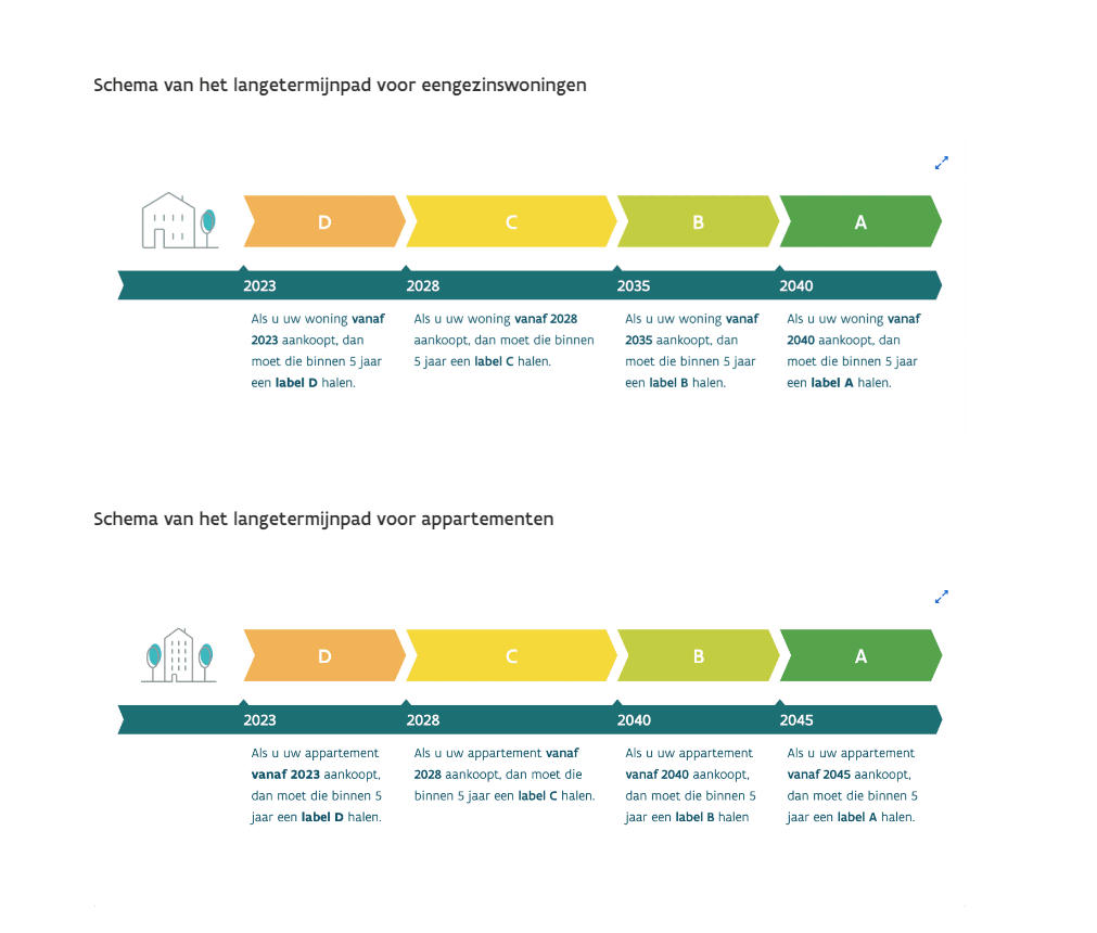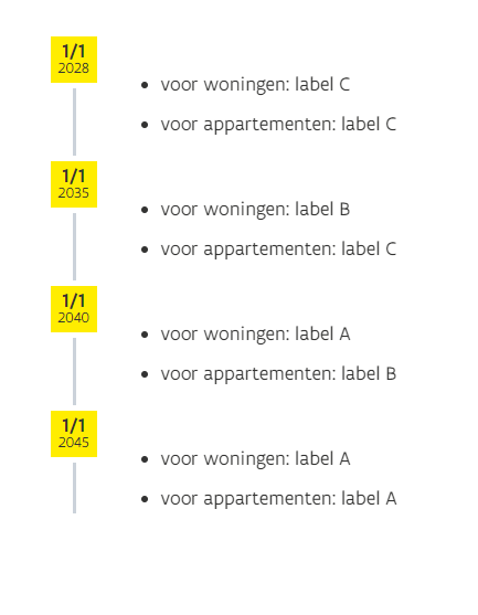 Het doel is dat alle woningen tegen 2050 label A behalen. Er zijn geplande verstrengingen in 2028, 2035, 2040 en 2045 om dit langetermijnpad te volgen.