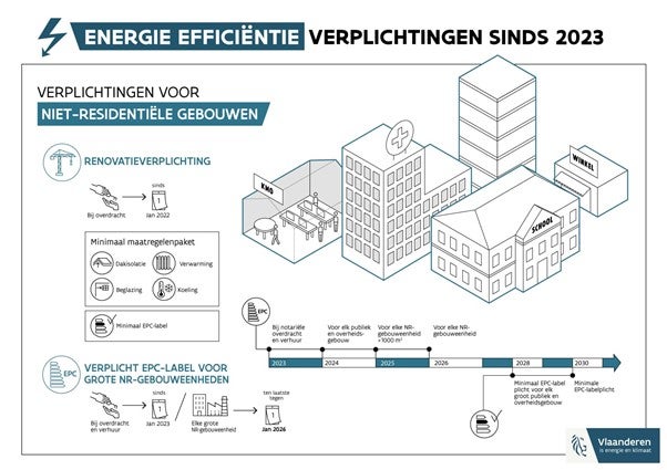 Vanaf 1 januari 2030 moeten zowel kleine als grote niet-residentiële gebouwen een minimaal energielabel behalen. Gebouwen in publieke en overheidsgebouwen hebben deze verplichting al vanaf 2028.