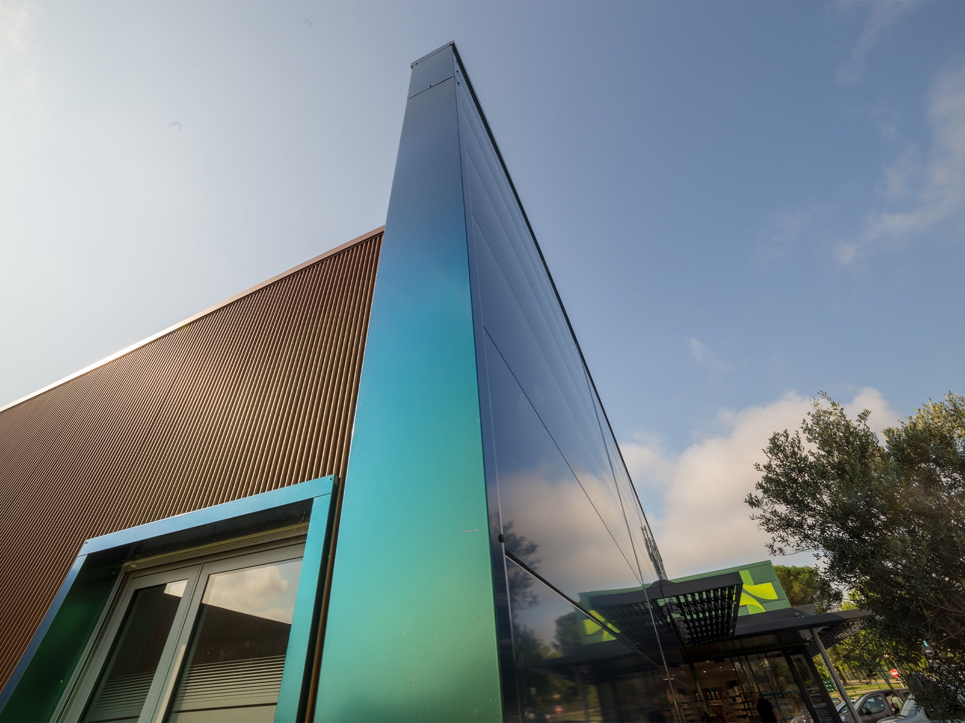 De metalen gevelbekleding van dit gebouw demonstreert de architecturale mogelijkheden die de metalen geveloplossingen van Joris Ide bieden. De dubbele gevelbekleding maakt het mogelijk om energieprestaties en akoestische kwaliteiten te combineren in overeenstemming met de huidige brandvoorschriften. Het brede gamma aan materialen en de volledige beheersing van technische kwesties maakten Joris Ide tot een uitgelezen partner bij het ontwerp van de metalen gevelbekleding voor dit gebouw.
