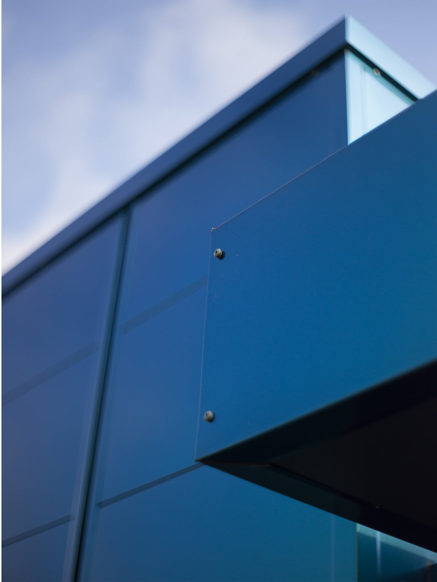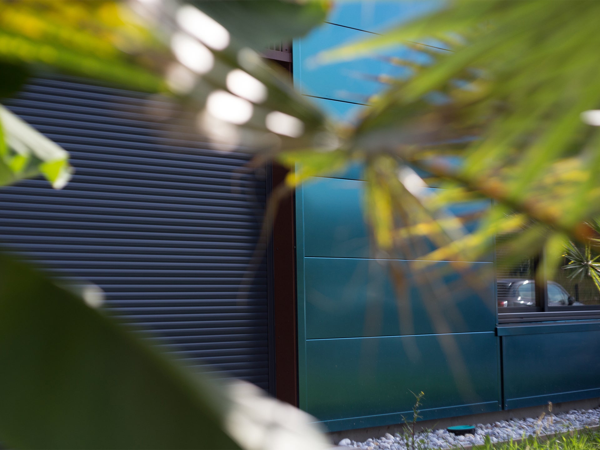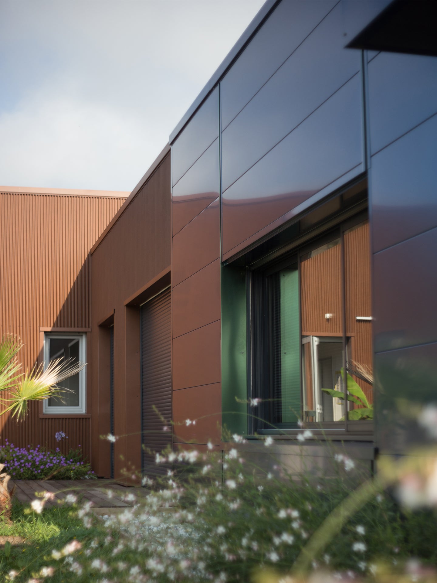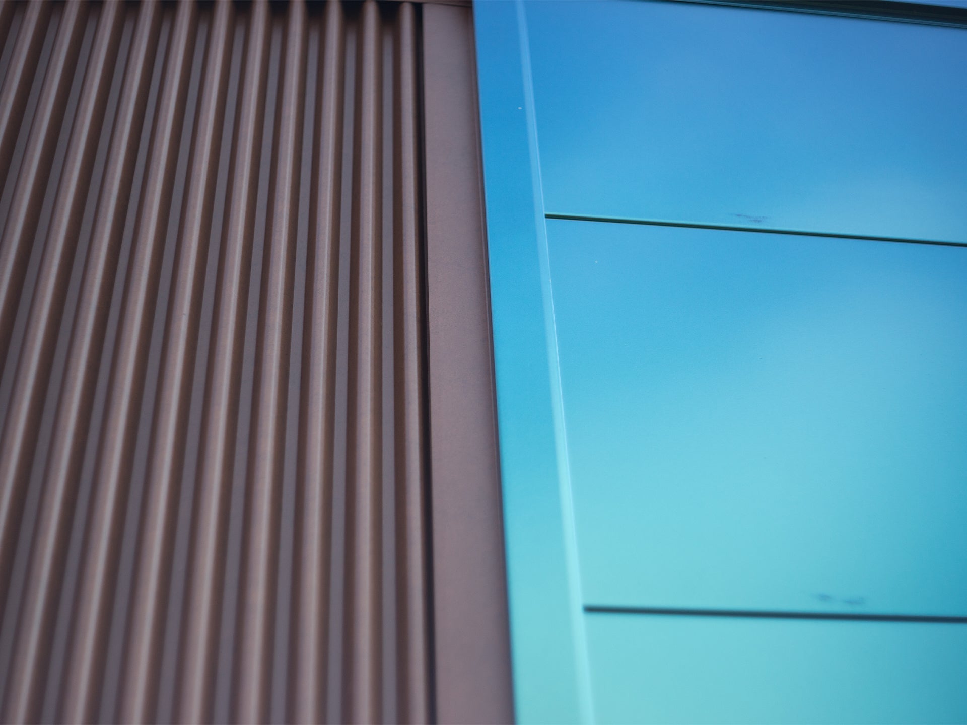 Het lineaire ritme van de lamellen wordt opzettelijk onderbroken door de geometrische, verticale vorm van het JI Ouragan profiel, een sinusoïdaal profiel met dicht op elkaar geplaatste golven. Het rechte en repetitieve patroon zorgt voor en slimme esthetische breuk met de rest van de constructie.  De plaat is gecoat met een "Oxydium" kleur die de matte en gelijkmatige oxidatie van staal imiteert