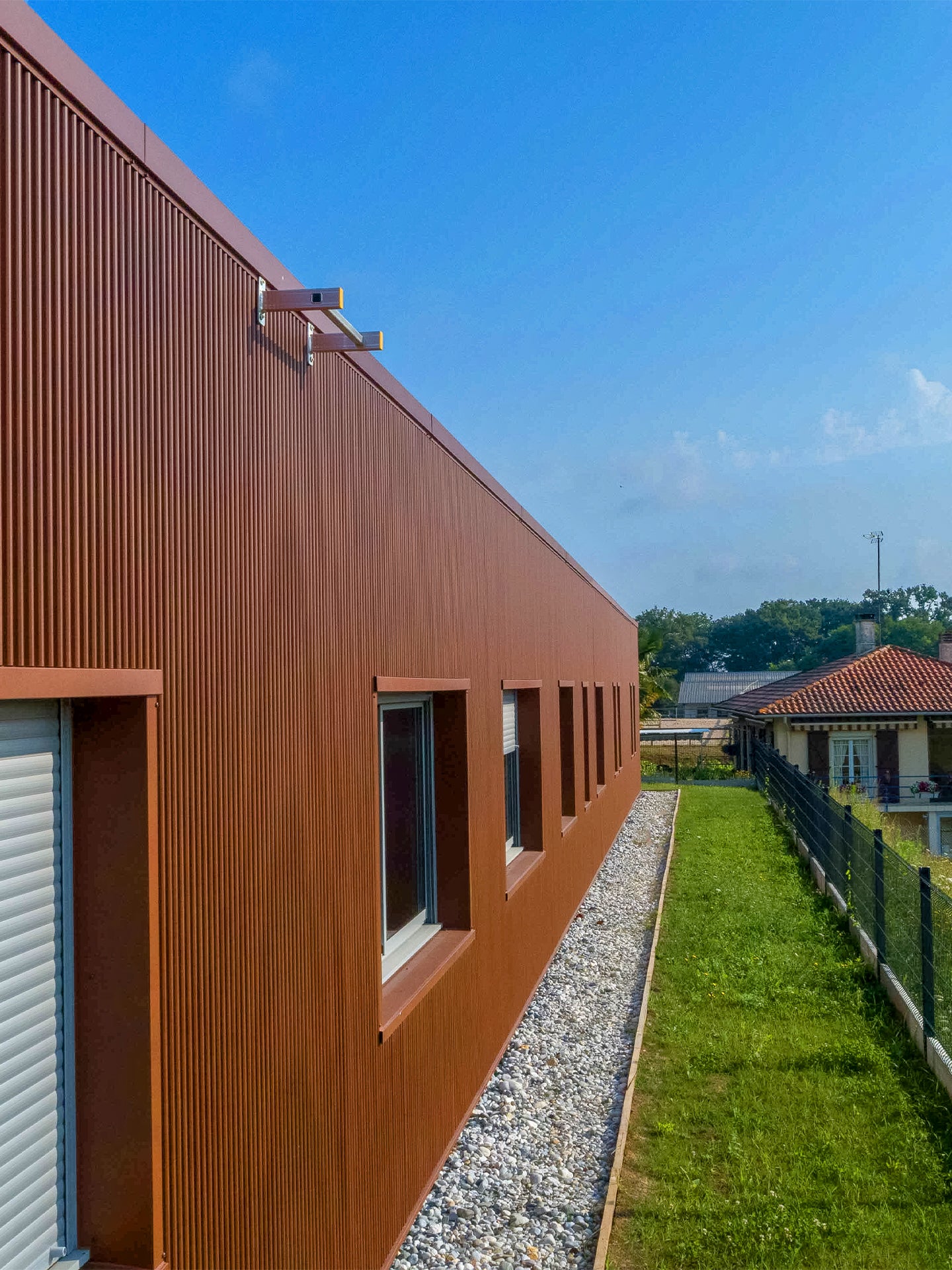 Het Arrigans gezondheidscentrum in Habas te midden van de Landes-regio is gebouwd met metalen gevelbekleding. Het centrum verenigt 17 medewerkers van verschillende medische beroepen, evenals een opticien en apotheek. Om tegemoet te komen aan de uitdaging van energieverbruik en comfort, werd het gebouw bekleed met 2 lagen. De eerste laag bestaat uit onze JI 92-500 binnendozen met isolatie bedekt met gevelpanelen.