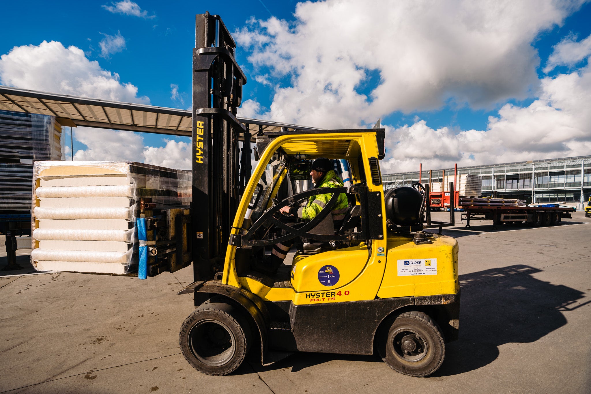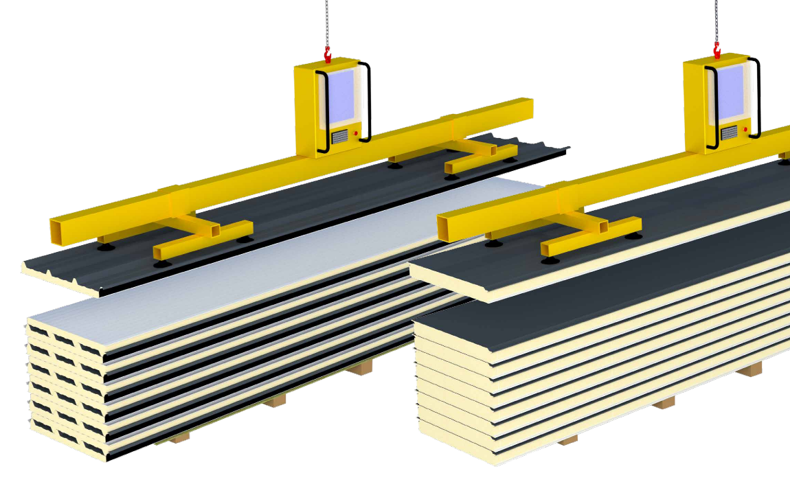 Het hanteren van sandwichpanelen en dakprofielen moet met geschikt materieel worden uitgevoerd om vervorming of beschadiging te voorkomen. Joris Ide adviseert het gebruik van vacuümheffers voor sandwichpanelen en verstelbare vorken voor heftrucks, vooral voor lange pakketten.