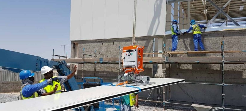 - De hijsbalk moet gecentreerd zijn ten opzichte van het zwaartepunt van het paneel, met een minimale zuigkracht van 0,15 kg/cm² van de zuignap.
