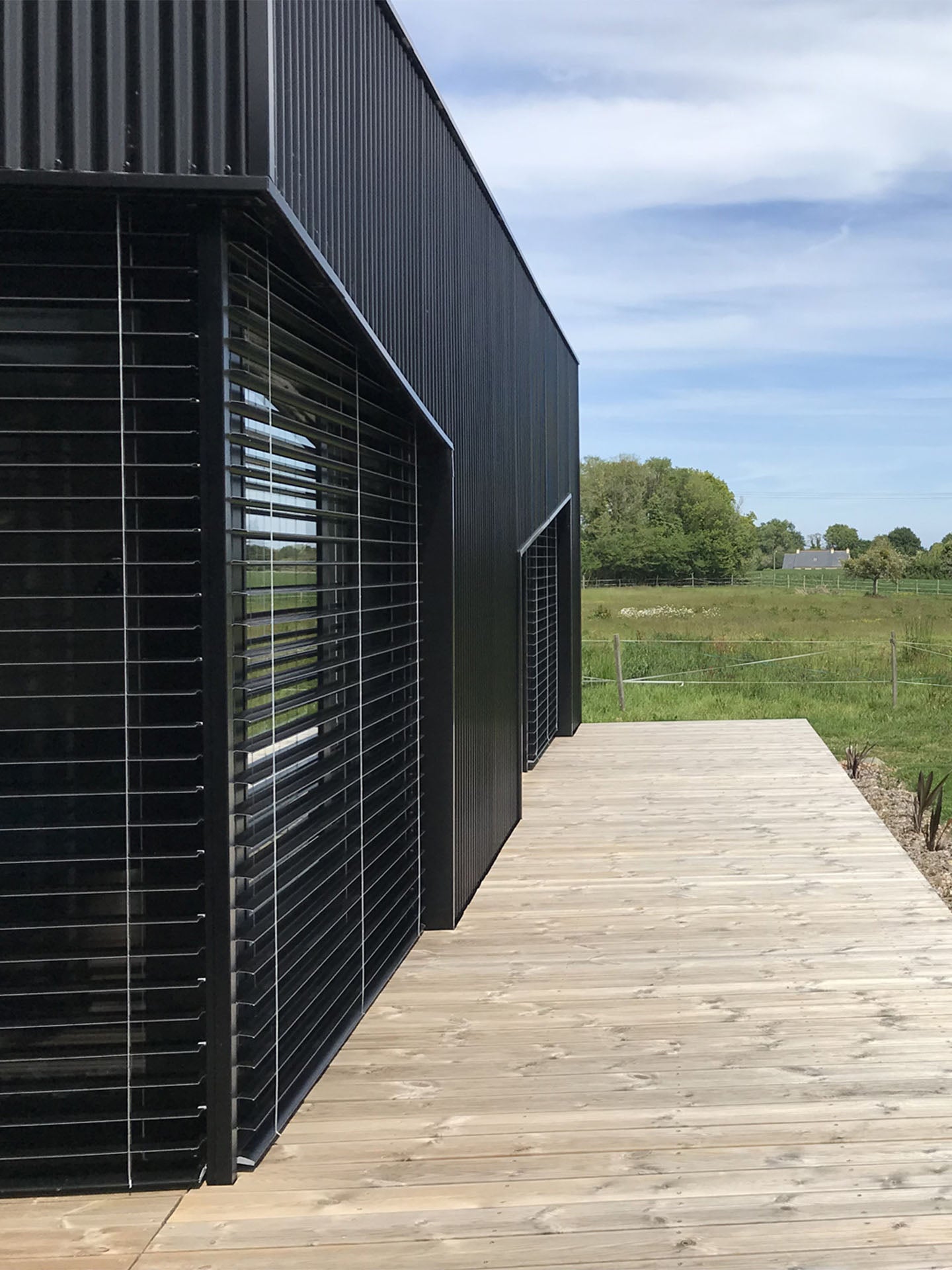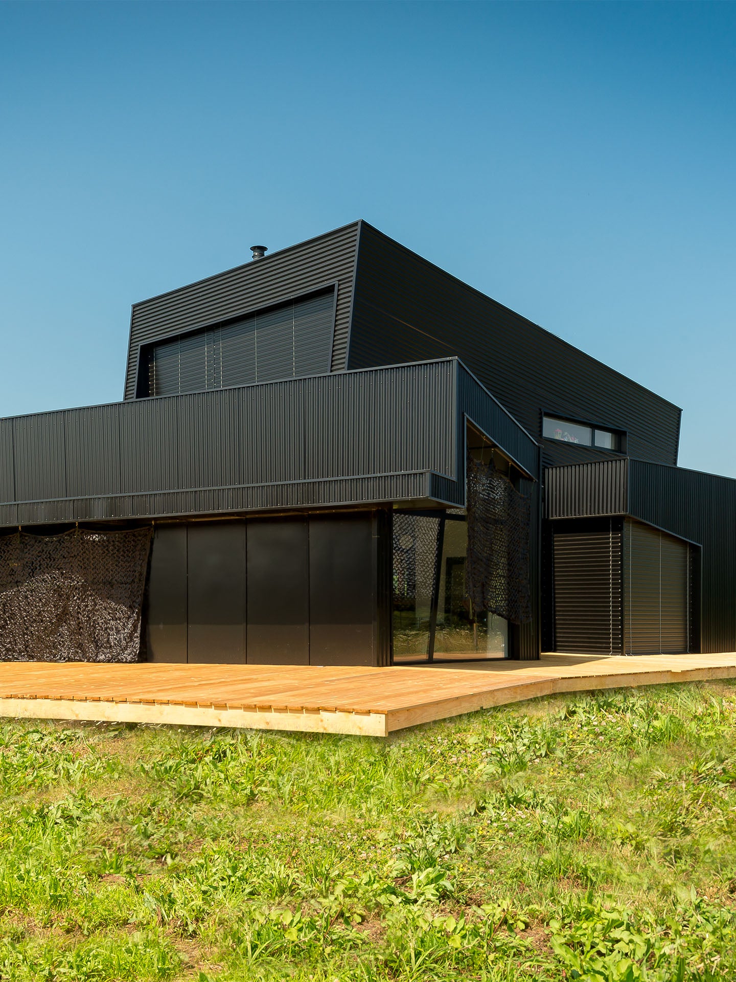 Huset är helsvart med vår korrugerade profil JI 18-076-988, och öppnas upp mot omgivningarna genom placeringen av dörr- och fönsteröppningar i olika format som gör det mesta av landskapet. Öppningarna har anpassats för att ge en känsla av djup och vardagsrummet ligger i sydväst.